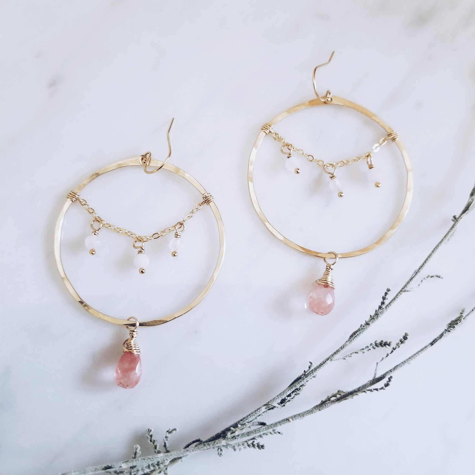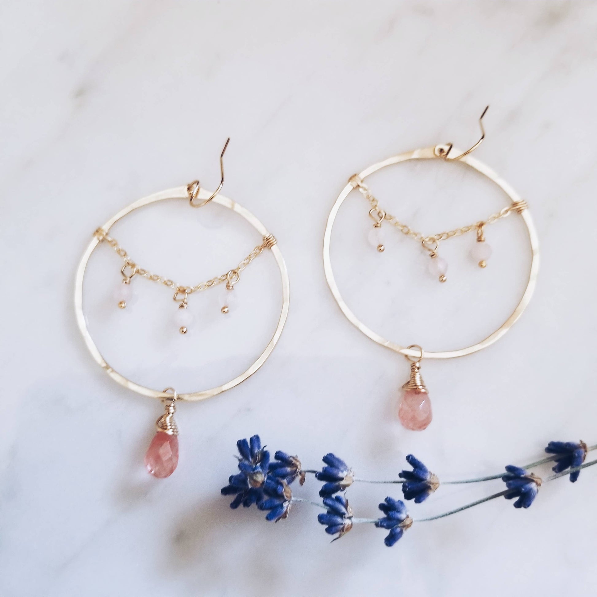 14K gold filled earrings with natural pink quartz and cherry quartz. Each bead is attached by hand.