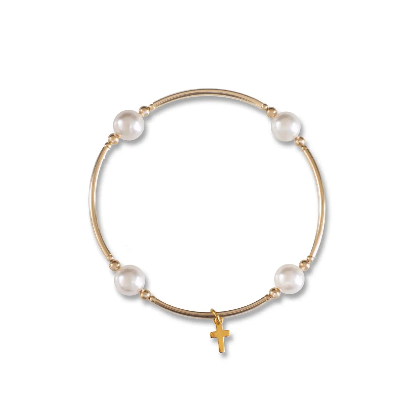 8mm White Pearl w Cross Charm LARGE Size Blessing Bracelet with 14k Gold Filled Tubes