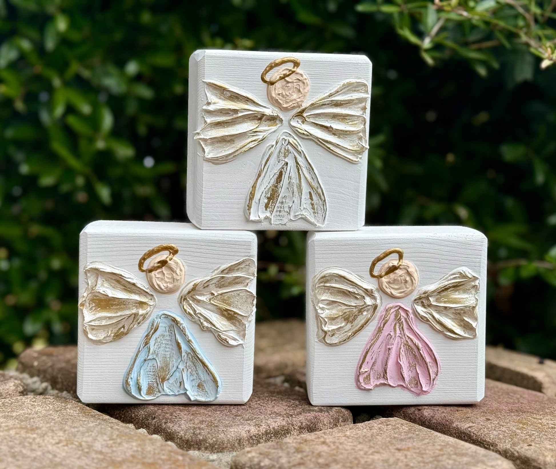 Hand textured and hand painted adorable angel on solid wood block. The raised texture gives depth and dimension to each piece. Choose from pink, white, or light blue. Body and wings of angels have gold highlights and each has a gold halo.
