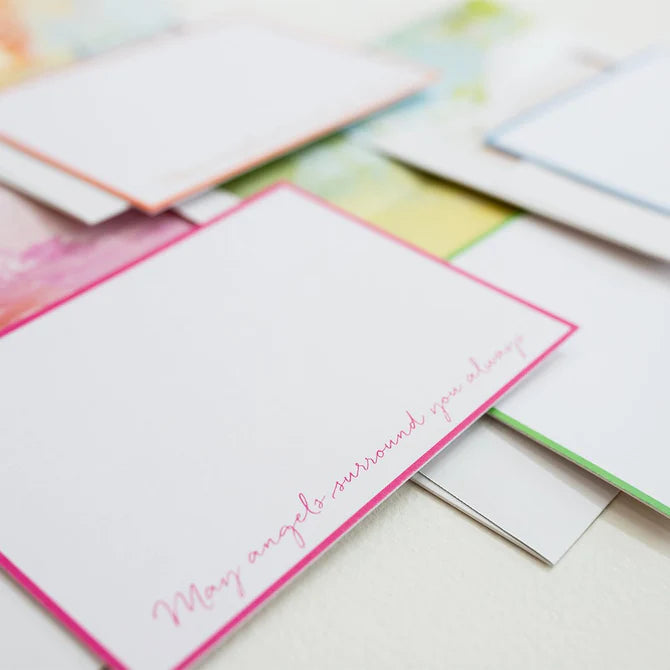 Whether you are sending a note of congratulations, encouragement or sympathy, our May Angels Surround You Always notecards are perfectly designed in their simplicity and are ideal for sharing your thoughts with beauty and flair. These notecards are available in green, pink, orange or blue. Each comes with matching envelopes featuring Anne Neilson’s artwork printed inside.