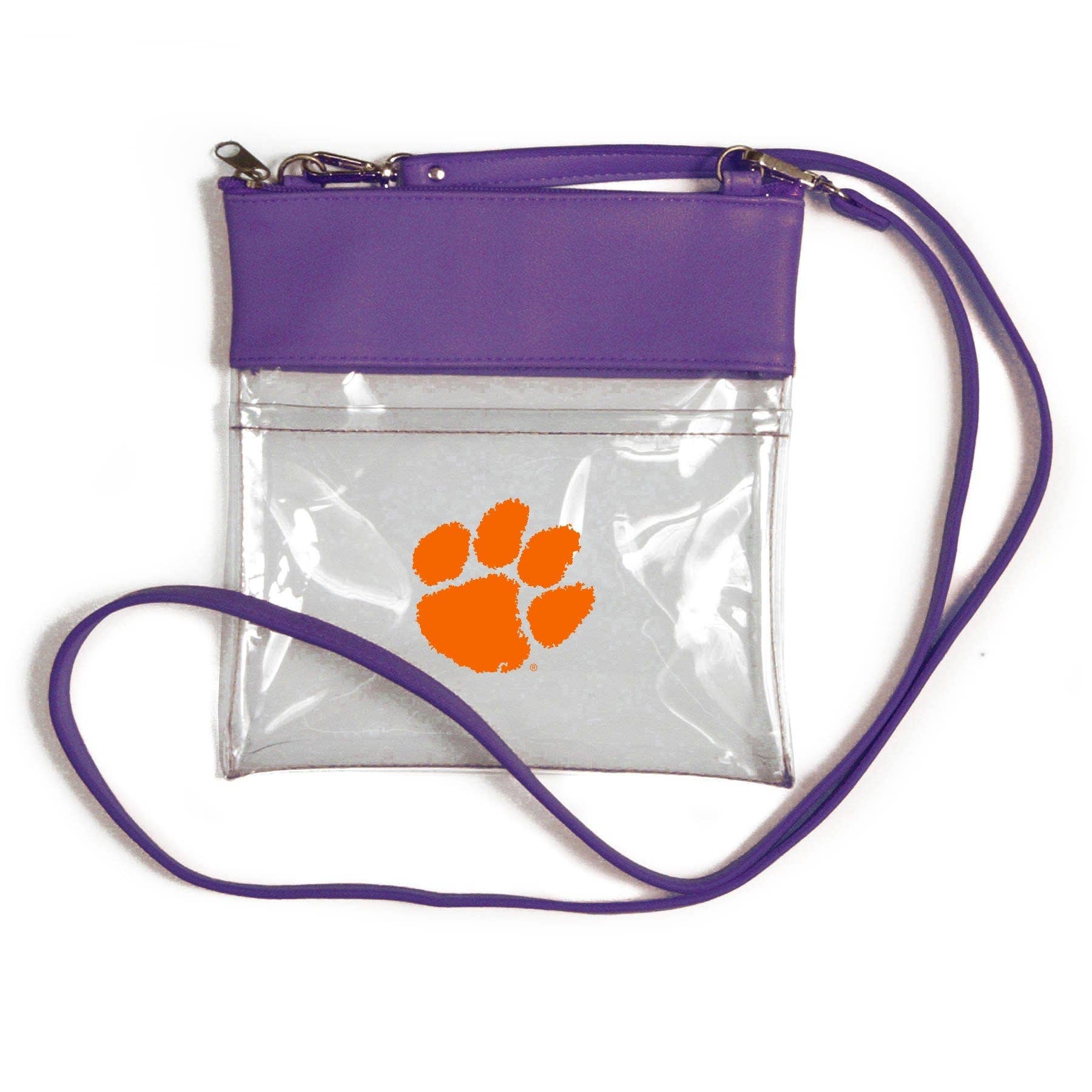 Breeze through security in style with Desden's stadium approved, best-selling crossbody which now comes with vegan leather trim and straps with the collegiate licensed logo on the front pocket. Quality workmanship with a luxurious, buttery vegan leather trim at the top makes this a perfect accessory for carrying your essentials to the game and the post-game night out.