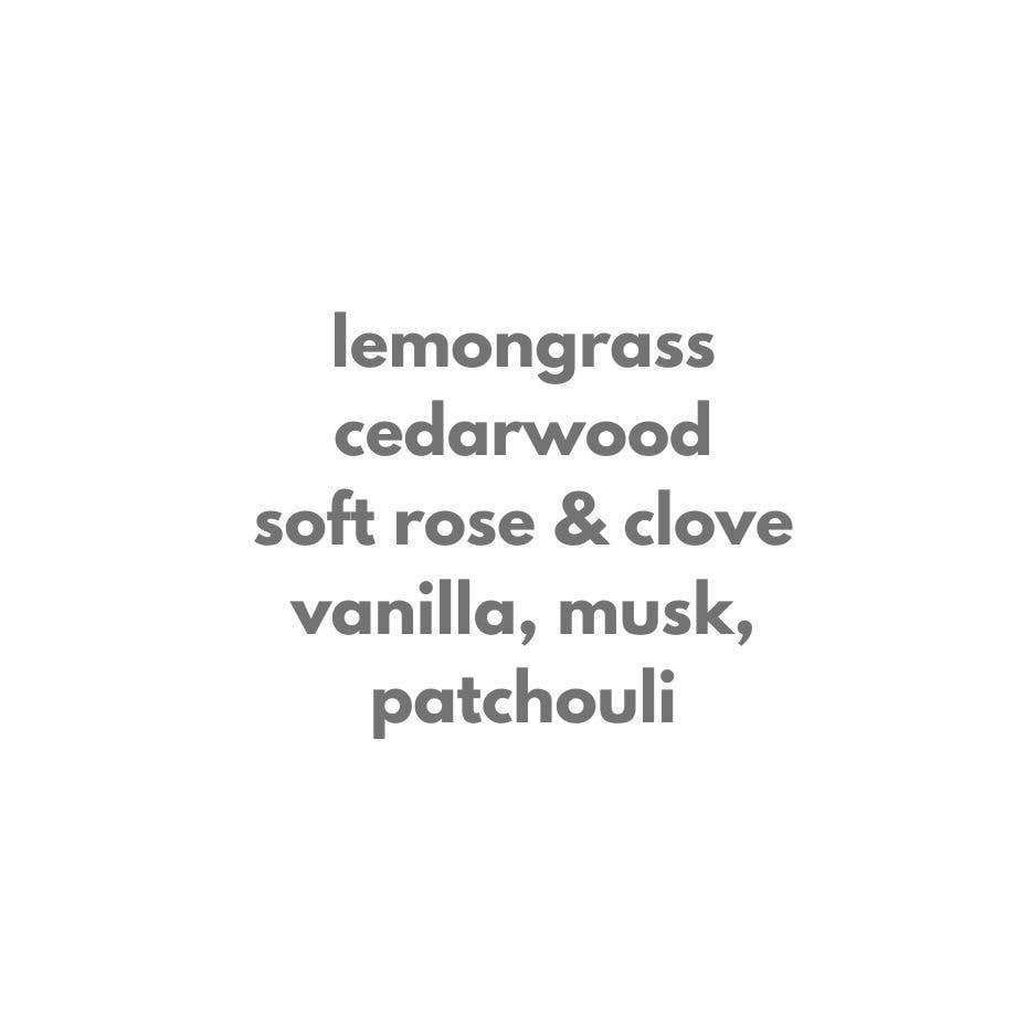 The fragrance of lemongrass, cedarwood, soft rose & clove crafted together for this truly recognizable scent. It then dries down with vanilla, musk, and a touch of patchouli.