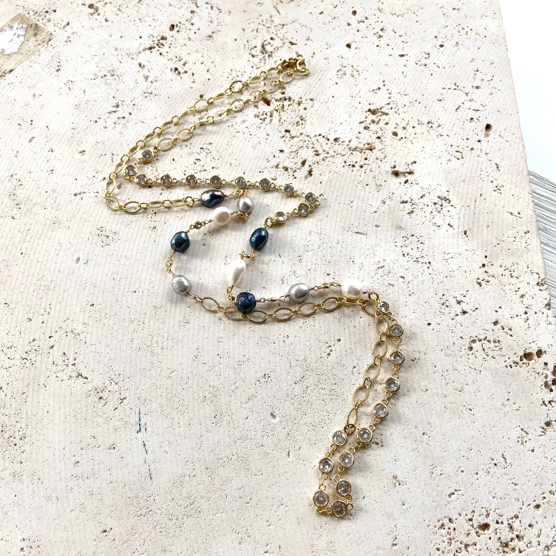Chic, modern, and endlessly versatile — this Denim Pearl Crystal Chain Necklace is a true showstopper. Freshwater pearls in soft denim blue, silver, and ivory tones are hand-wrapped along a shimmering gold chain, accented with bezel-set crystals for just the right touch of sparkle. Its longer length makes it perfect for layering or wearing as a stand-alone statement piece. Whether paired with casual denim or an evening dress, this necklace brings effortless elegance to every look. This necklace has a tiny clasp so you can wrap it around twice for a shorter look.