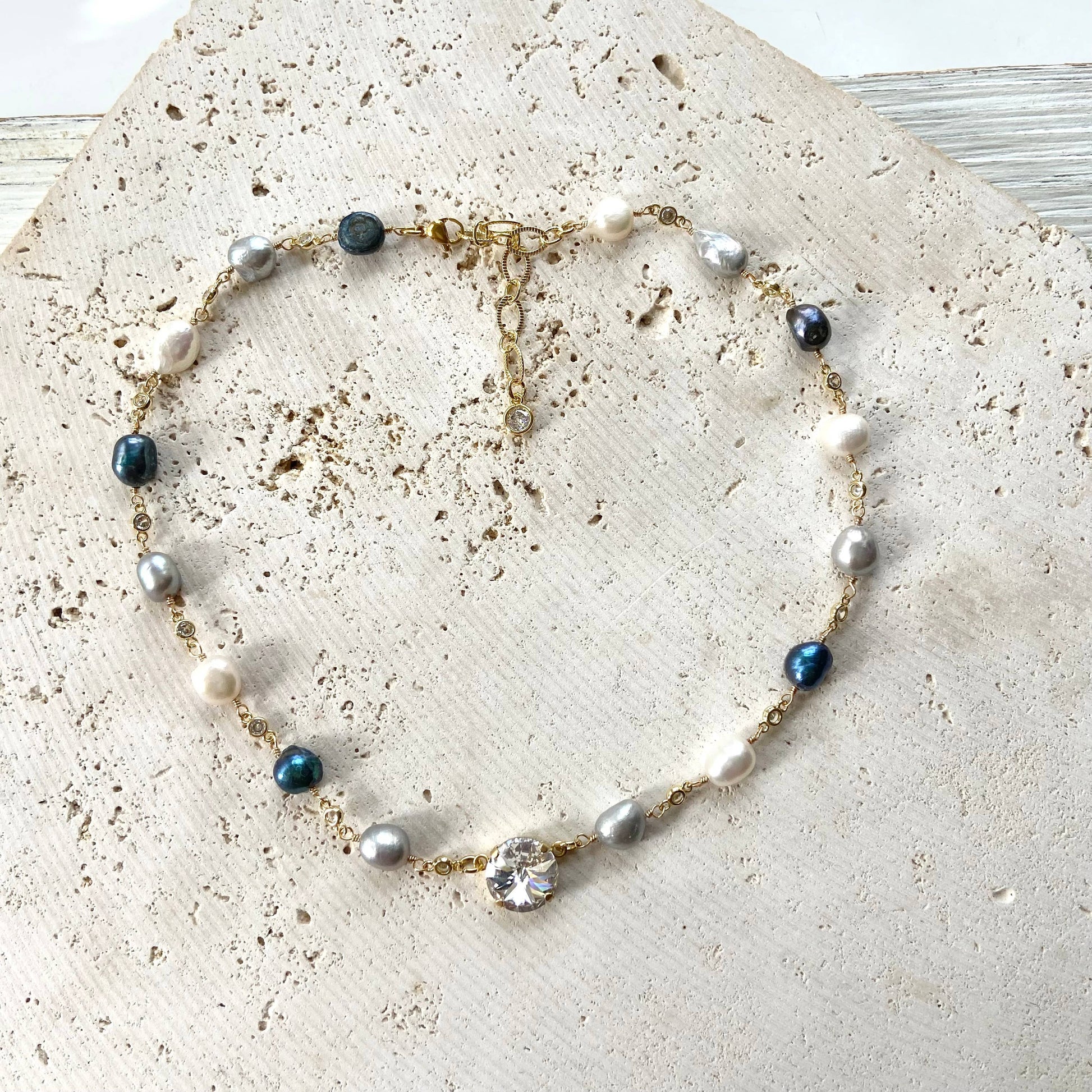 The Denim Pearl Crystal Necklace brings together the elegance of freshwater pearls with the brilliance of a bold solitaire 14mm Swarovski crystal centerpiece. Featuring hand-selected irregular pearls in denim blue, soft grey, and ivory tones, this piece is designed to add a modern sparkle to timeless pearl styling.