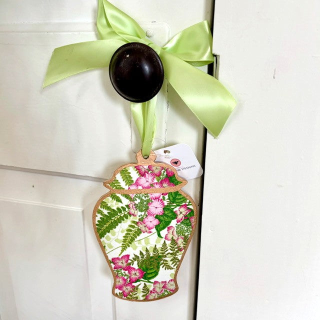 This hand decoupaged and painted 8” door hanger is made from wood and is perfect to hang from a doorknob, in a window or to add to a wreath for home decor.