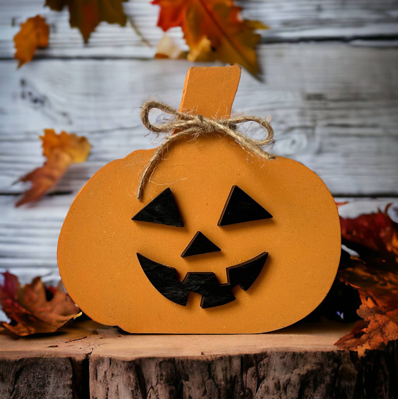 Handmade Halloween decoration. The 4.5” x 4.25” wood pumpkin is cut out of 3/4” MDF, painted orange color and features a 3D cut wood face.