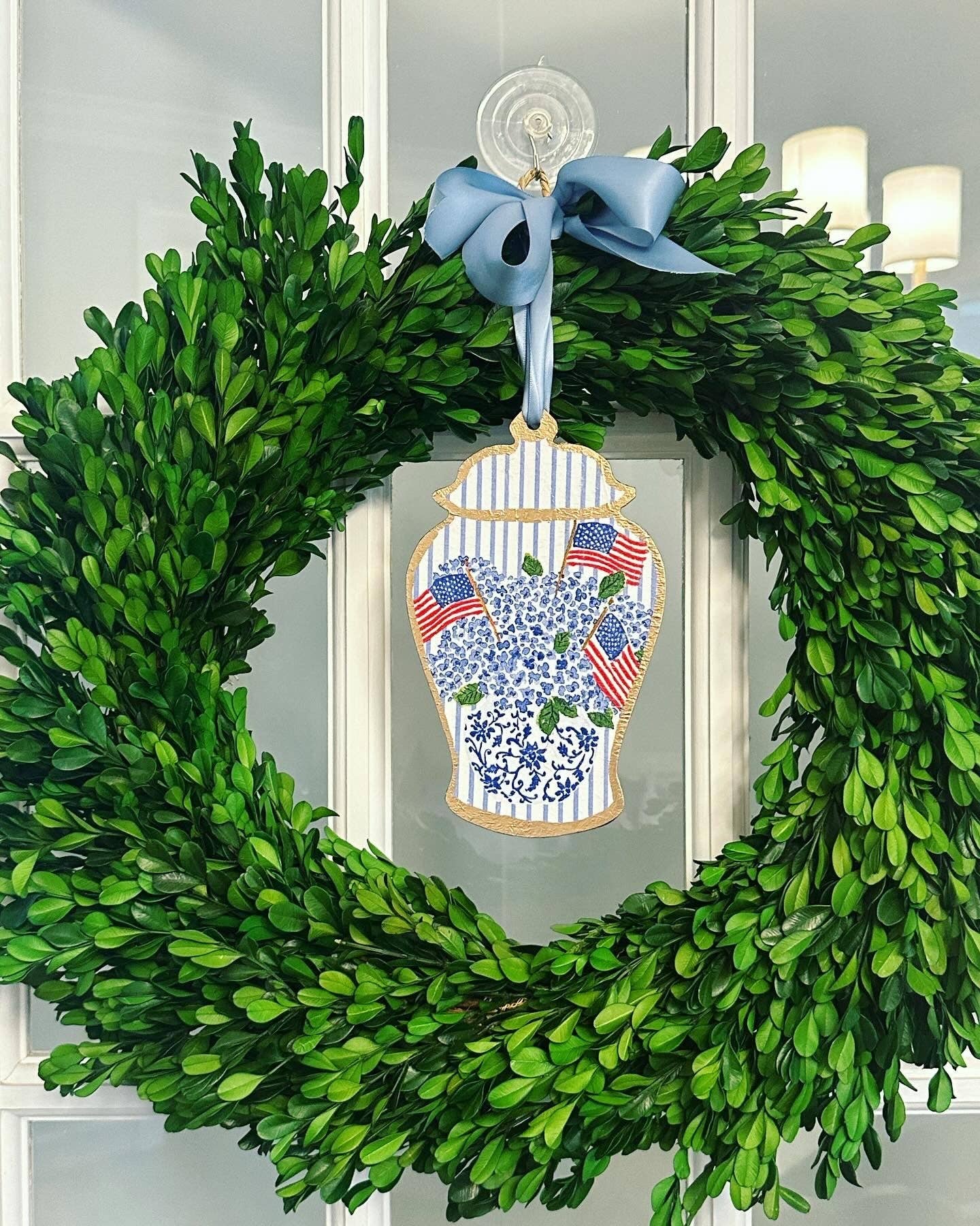 Lightweight ginger jar door hanger perfect for hanging on a door knob by itself or adding to your boxwood wreath.