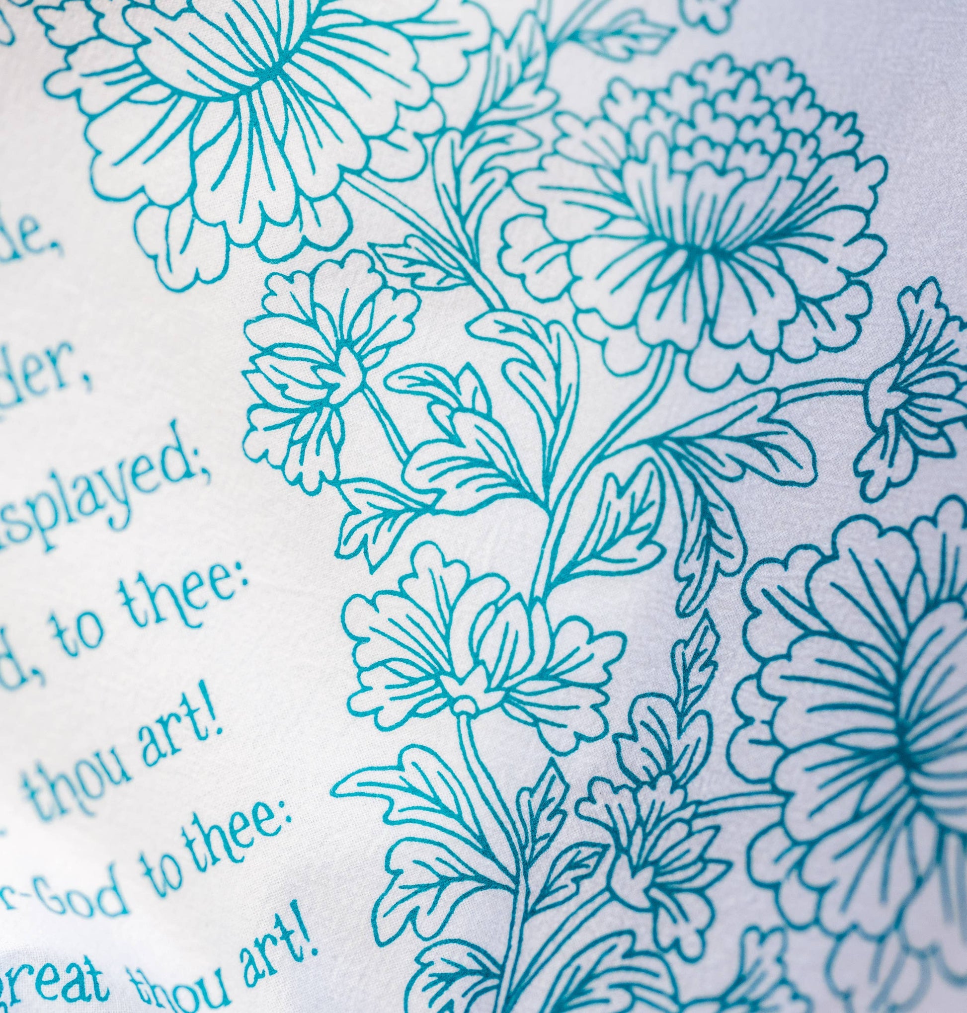 The "How Great Thou Art" hymn tea towel is printed in aqua and features lyrics from the hymn. Made of 100% cotton, these flour sack tea towels easily and cost-effectively replace disposable paper towels with high absorbency and durability. Generously sized, lint free, and made to last a lifetime. Perfect for gift giving. Illustrated by Kate Whitley. • 24″L x 20″W Machine-washable, 100% cotton • Screen printed in Mt. Juliet, Tennessee • Made in USA