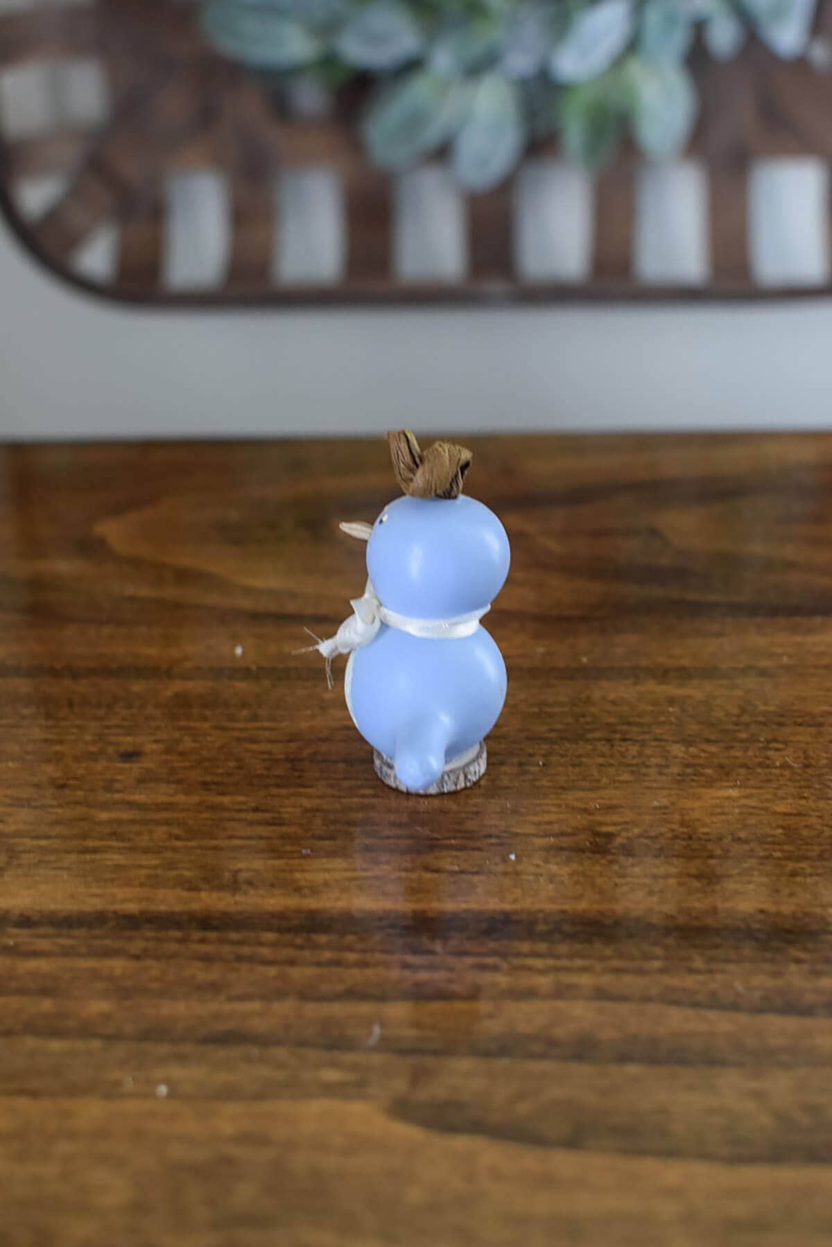 The Lil Birdie gourd is hand-painted blue and has an adorable cream bow. She is perched on top of a little wooden biscuit base.