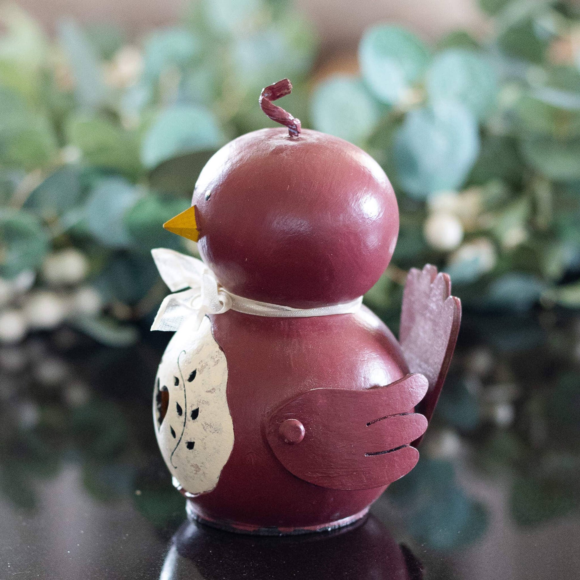 Meadowbrooke Gourd's Red Bird is a perfect year-round decoration. This bird has red wings and a red tail along with a yellow beak and a white sponged belly.