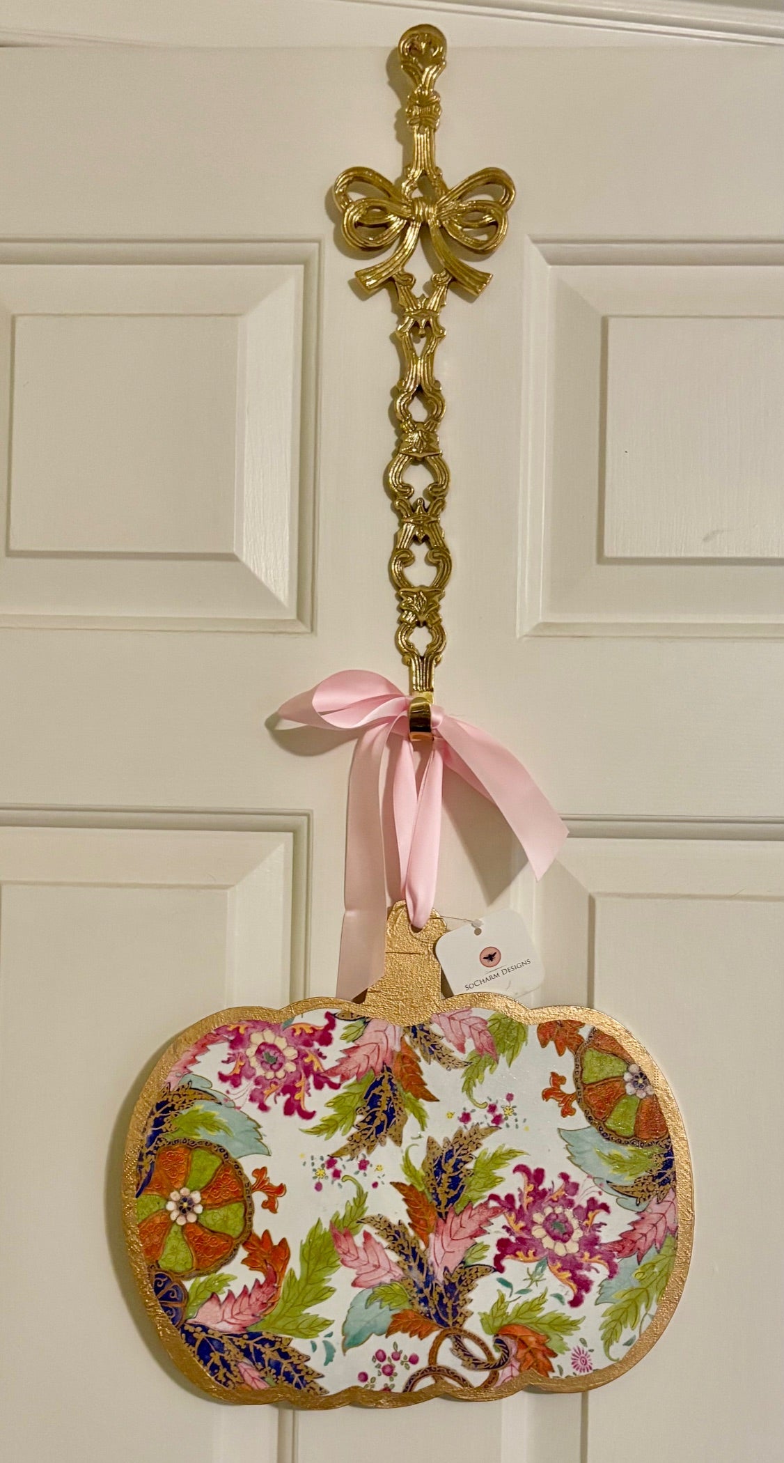 This hand decoupaged and painted 12” door hanger is made from wood and is perfect to hang on the door alone or to add to a wreath for home decor.