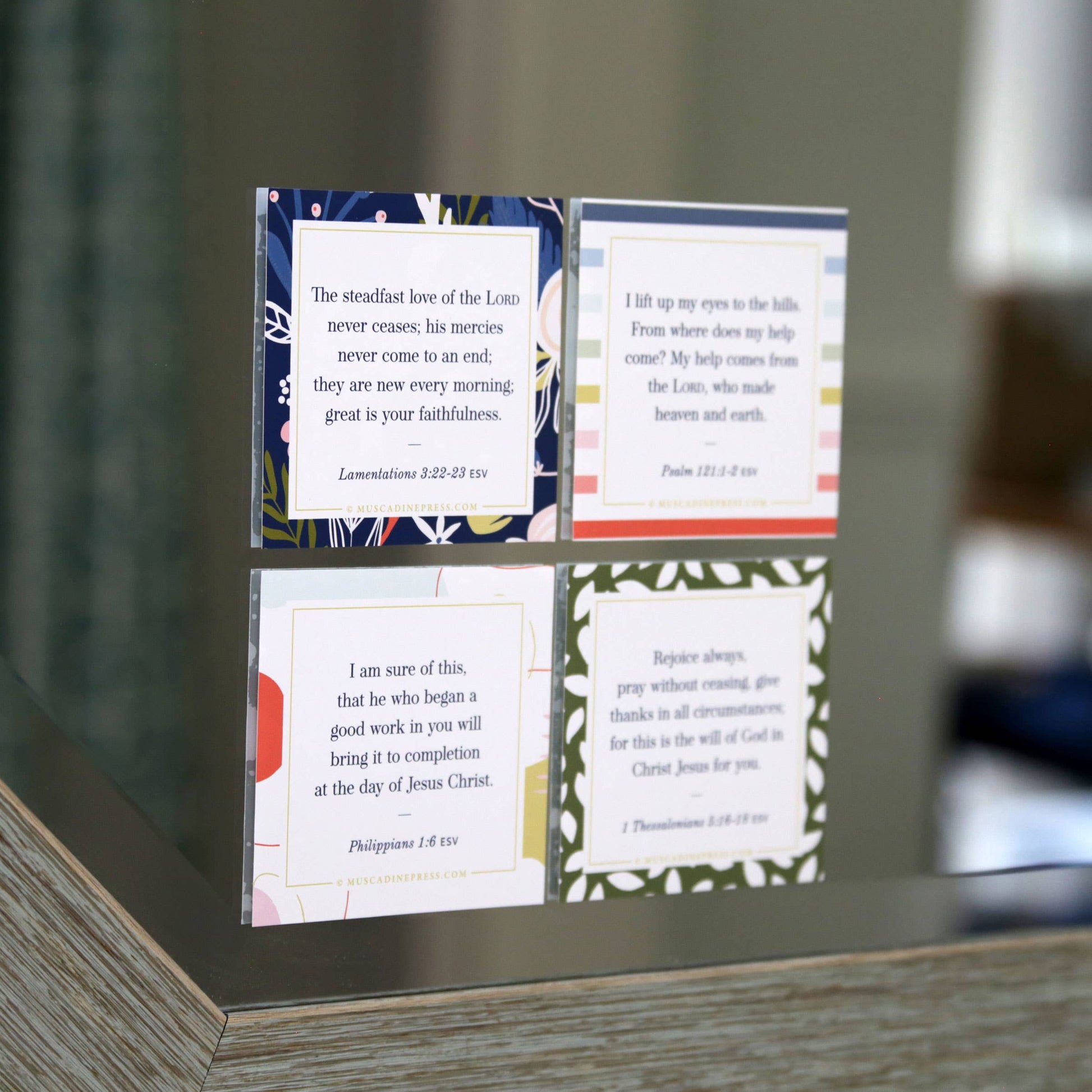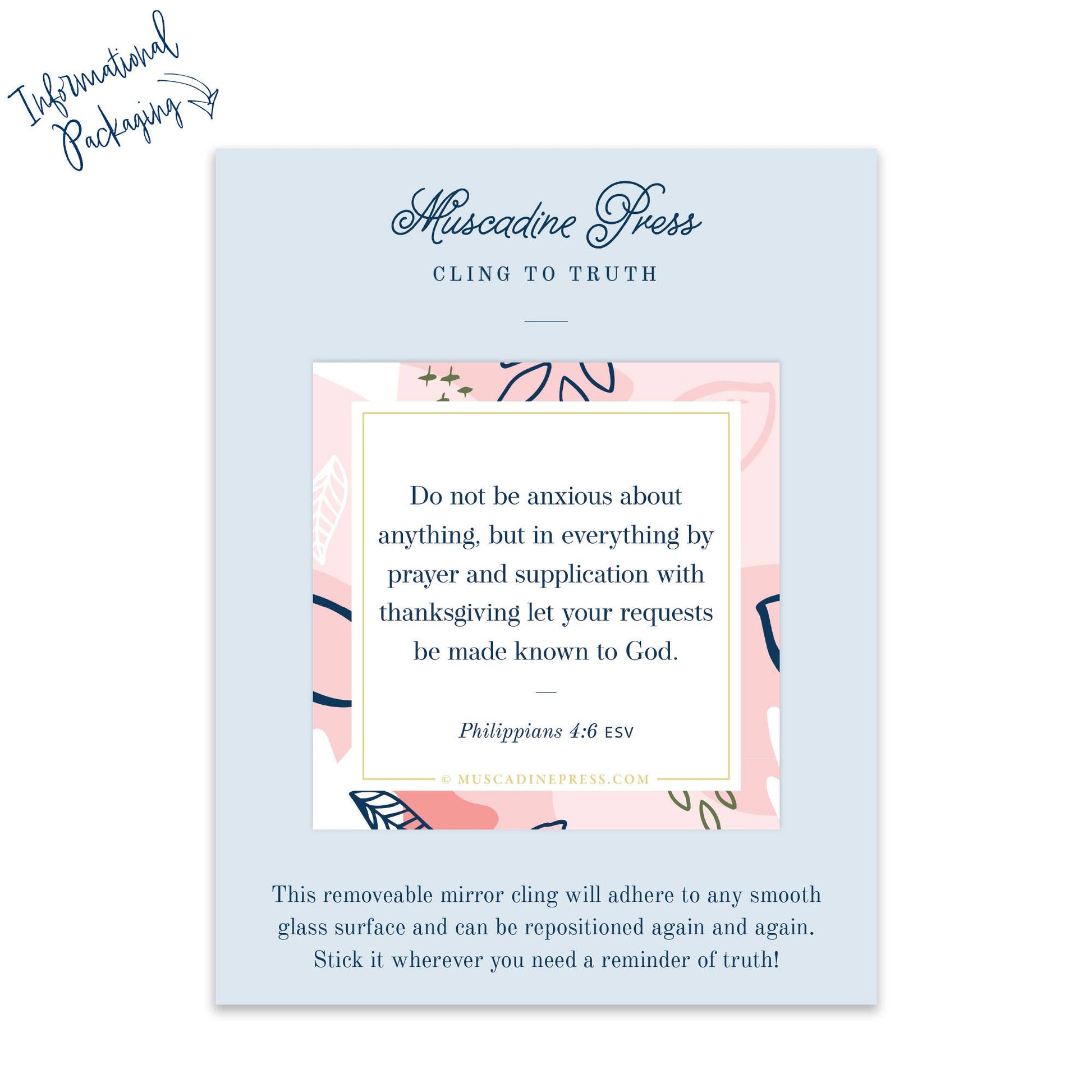 Cling to truth with our bright and cheerful scripture static clings. Designed to uplift, encourage, and remind you of truth, even in the middle of busy days. Stick them on the mirror, a window, or anywhere else you need a reminder of truth.
