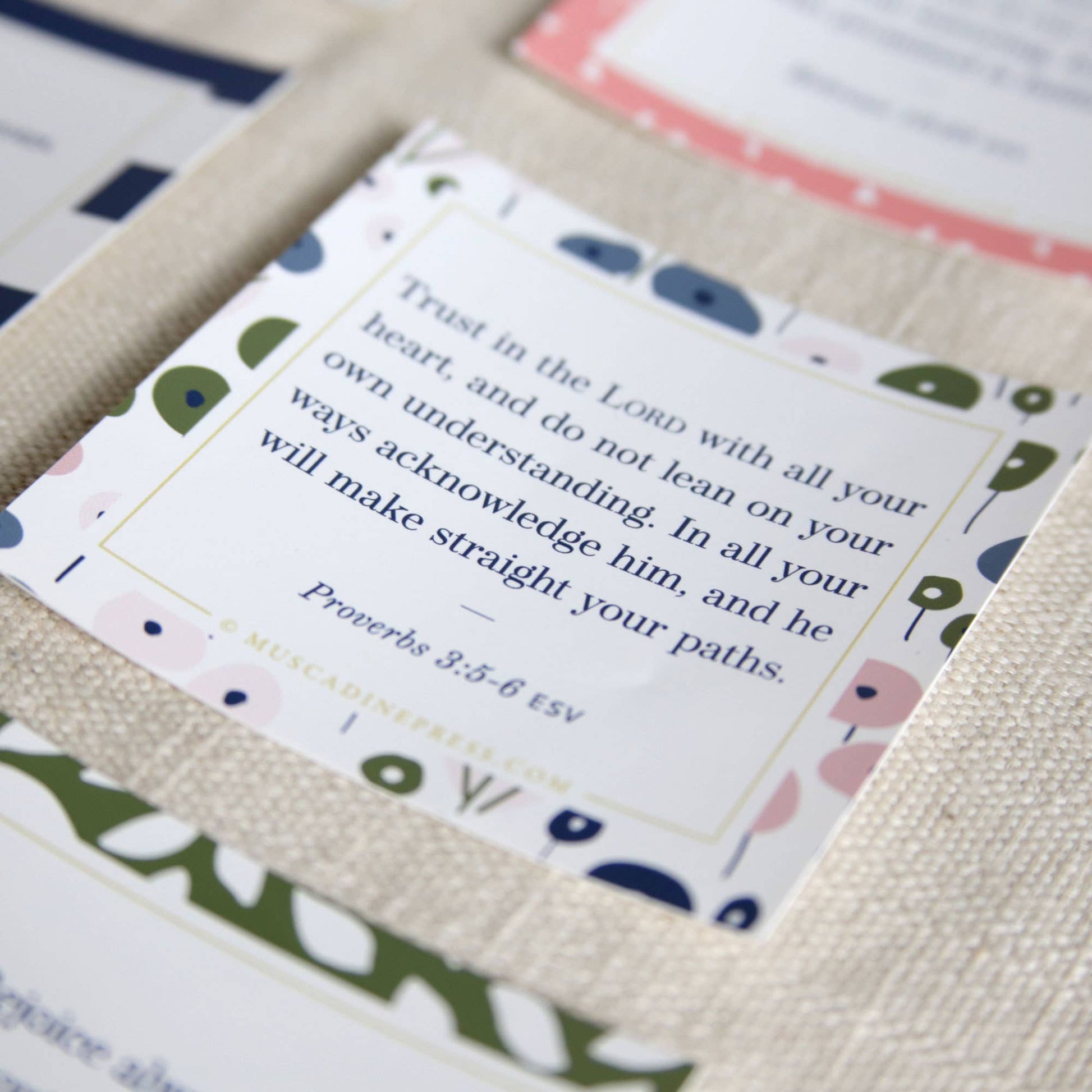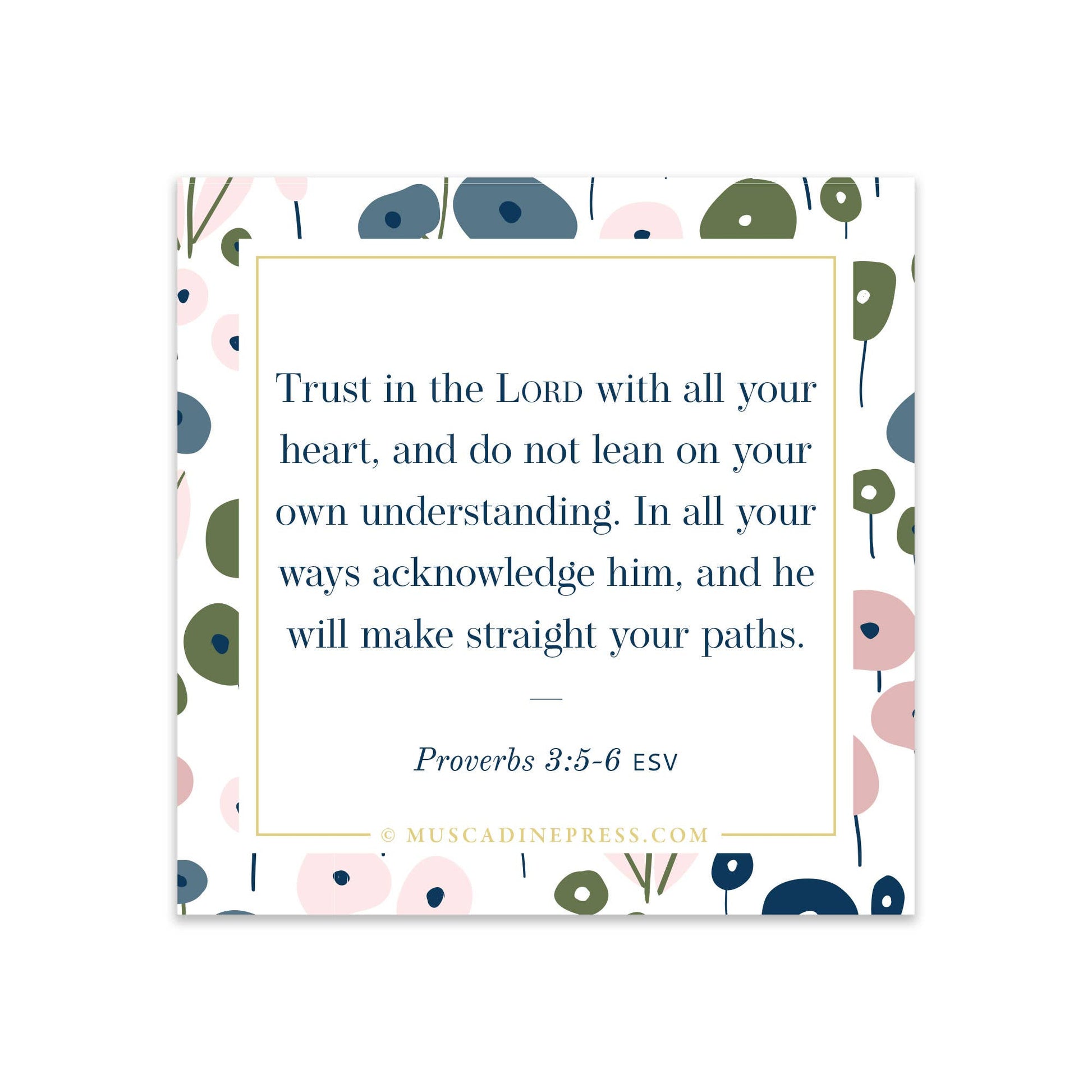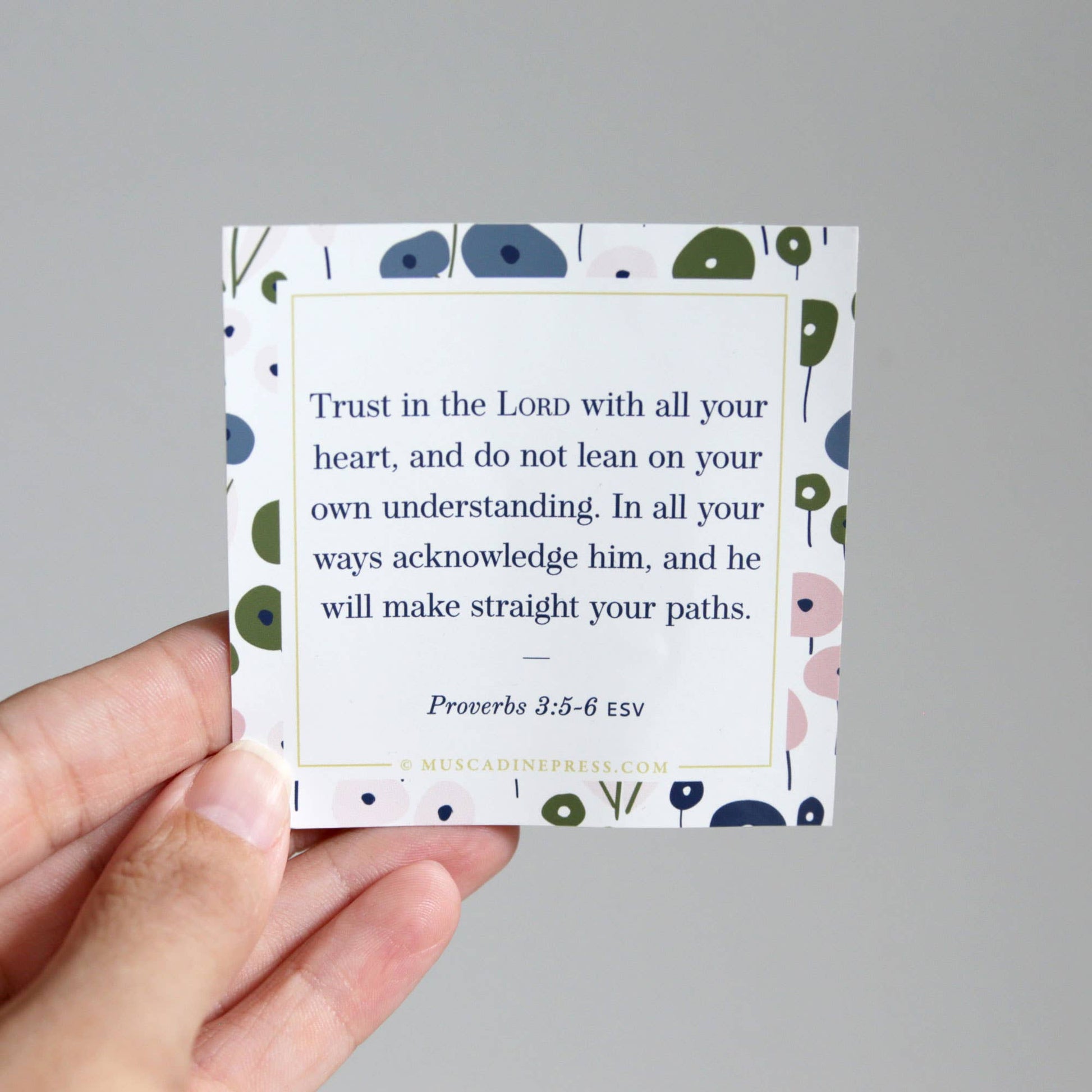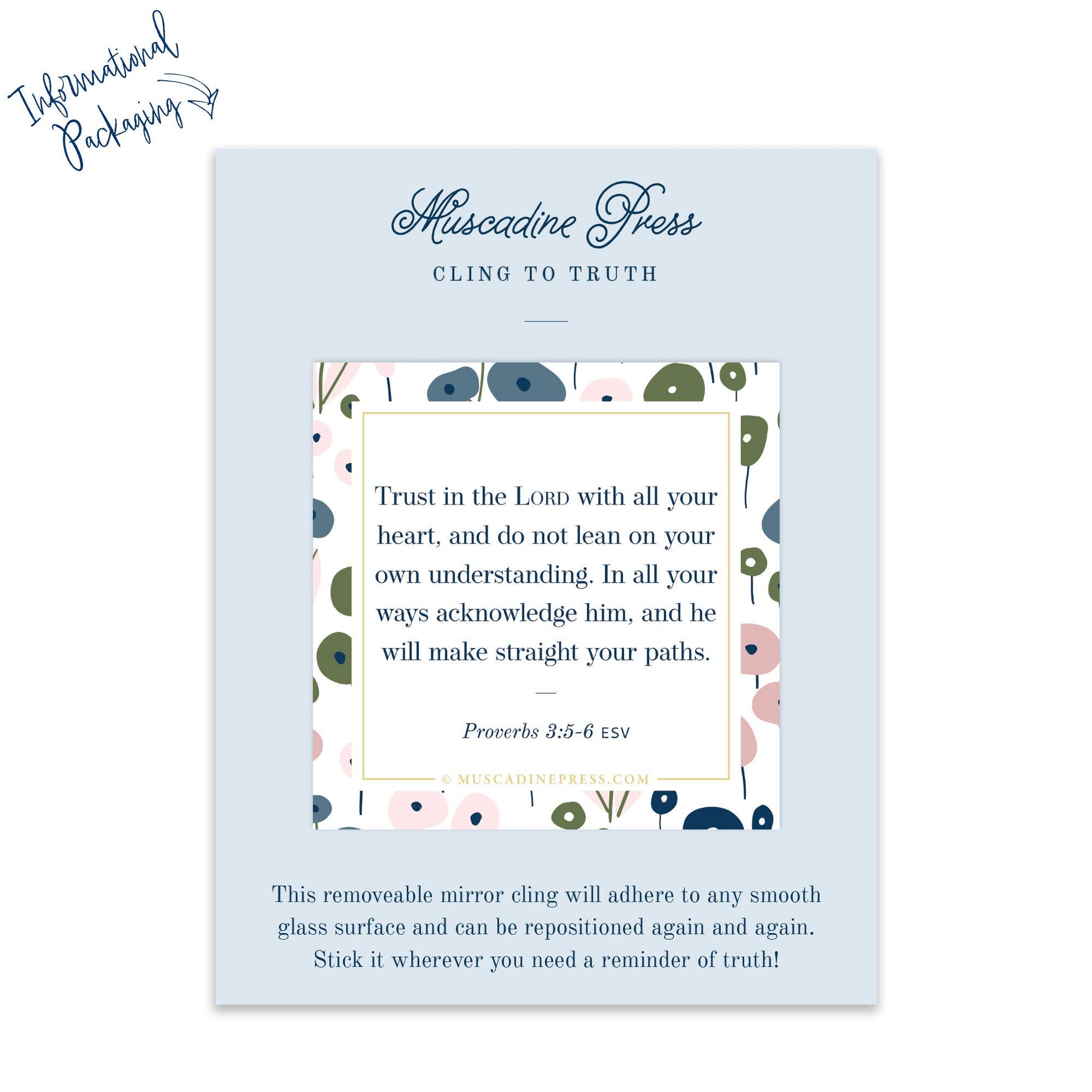Cling to truth with our bright and cheerful scripture static clings. Designed to uplift, encourage, and remind you of truth, even in the middle of busy days. Stick them on the mirror, a window, or anywhere else you need a reminder of truth. "Trust in the Lord with all your heart, and do not lean on your own understanding. In all your ways acknowledge him, and he will make straight your paths." Proverbs 3:5-6