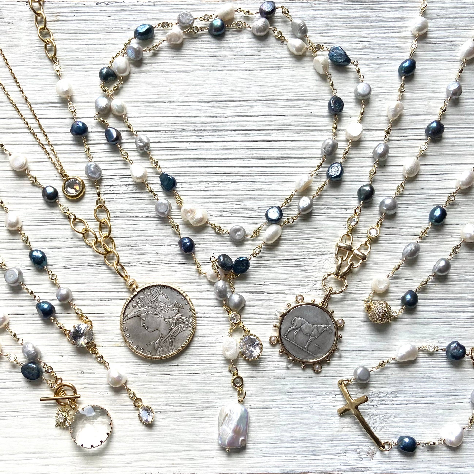 - Freshwater pearls in a blend of ivory, silver, and deep denim blue mix
