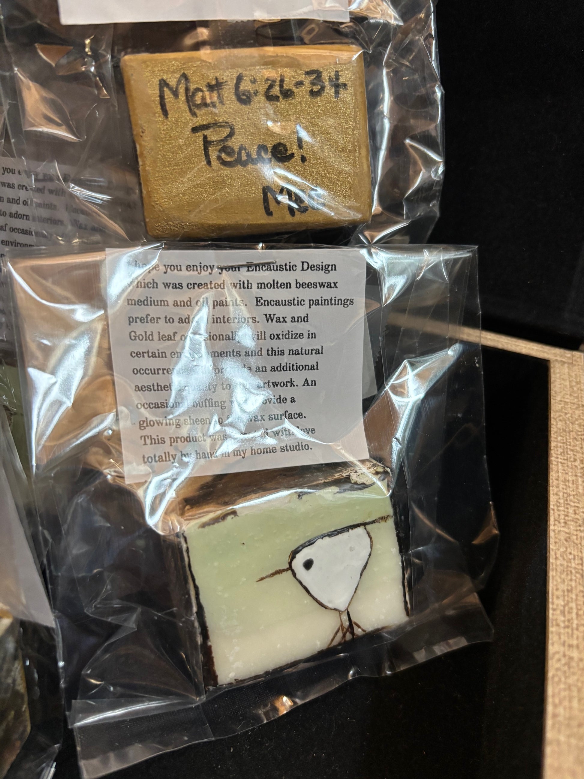The tiny sandpiper is painted using Encaustic design using molten beeswax and oil paints.