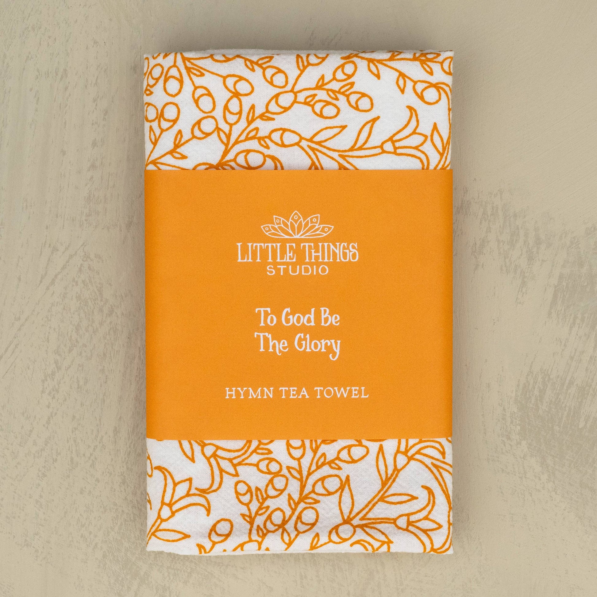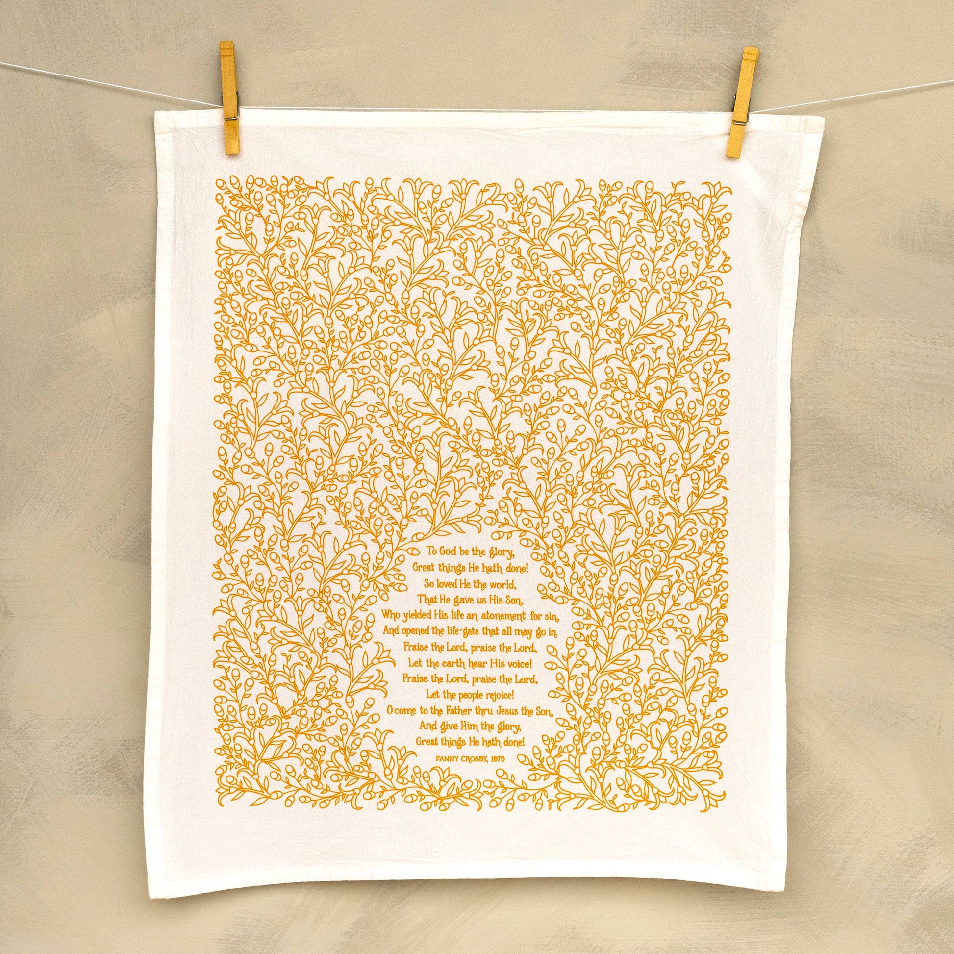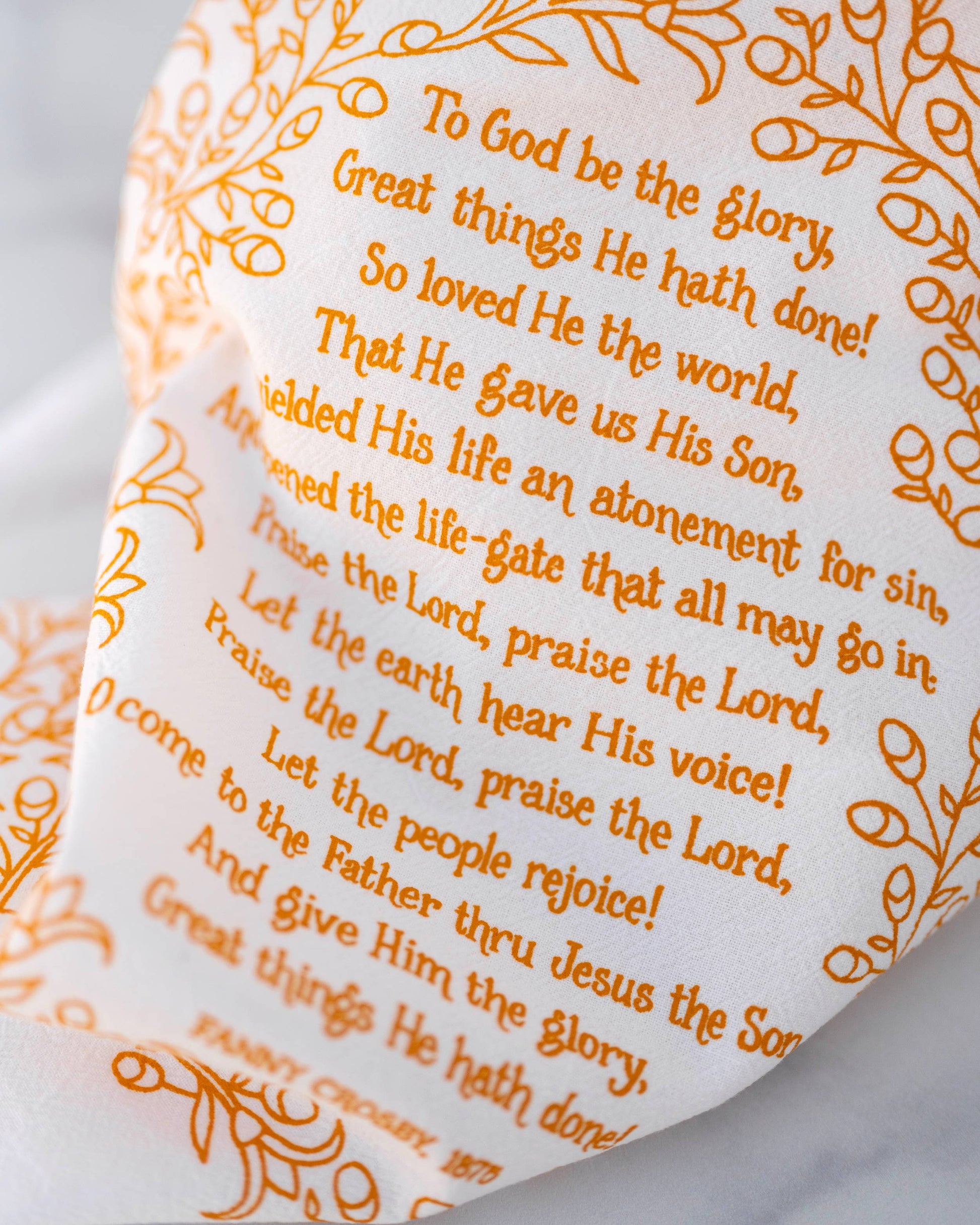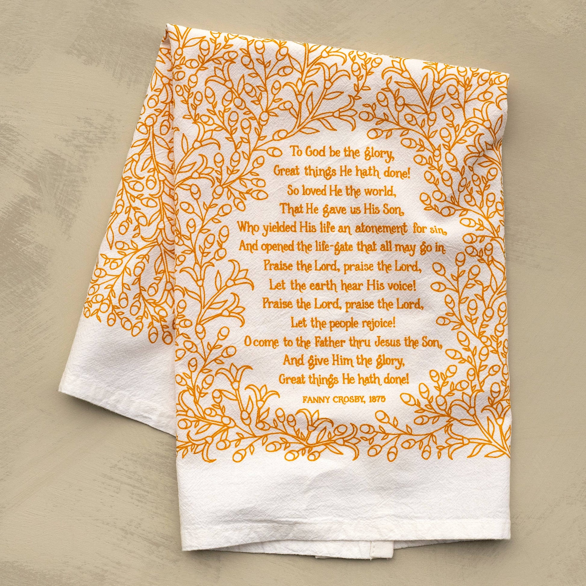 The To God Be the Glory hymn tea towel is printed in pumpkin orange and features lyrics from the hymn accented by intricate floral illustrations. Made of 100% cotton, these flour sack tea towels easily and cost-effectively replace disposable paper towels with high absorbency and durability. Generously sized, lint free, and made to last a lifetime. Illustrated by Kate Whitley. • 24″L x 20″W • Machine-washable, 100% cotton • Screen printed in Mt. Juliet, Tennessee • Made in USA