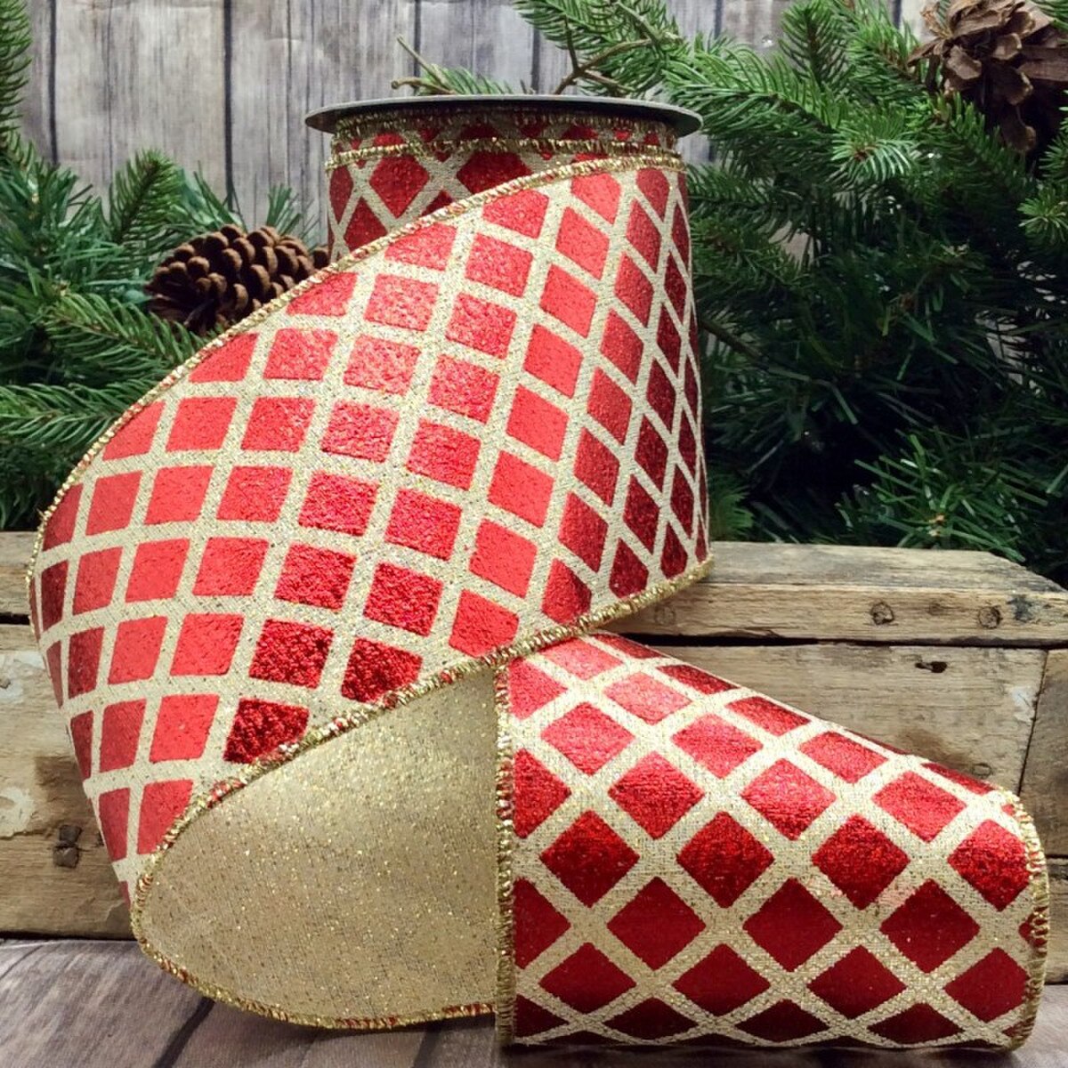 4" wide Red & Gold Harlequin metallic ribbon; wired
