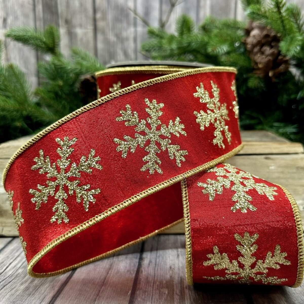 2.5" wide Red with Gold Snowflakes Dupion Silk Ribbon; wired